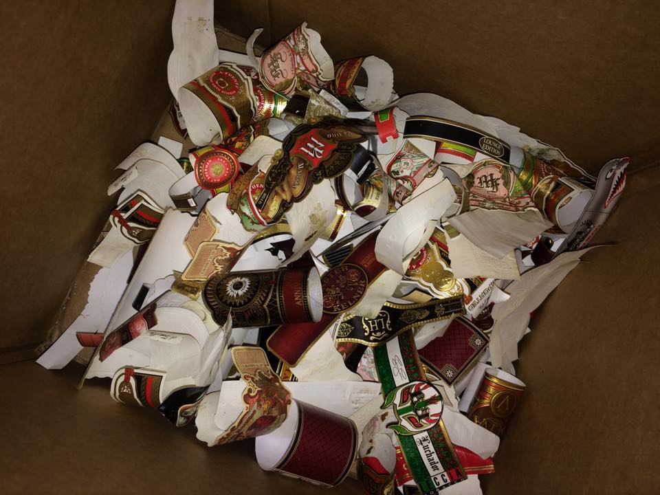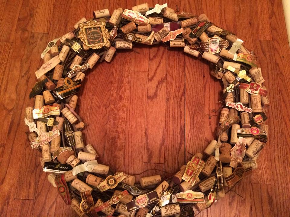 2. After the corks have been glued to the wreath and are set, it’s time to add your own personal touch. In this case I used cigar bands and a framed picture of the Brick House Cigar Shop logo.