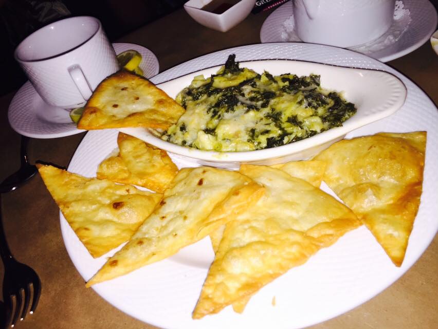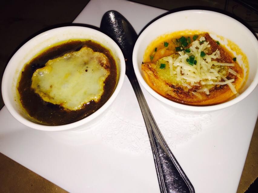 Before ordering I ALWAYS ask the server what their favorite thing on the menu is or what they would recommend. This is one of my tests to see how knowledgeable and honest the server is, and usually how I help narrow down my menu choices. The server recommended creamy kale and artichoke dip served with tortilla chips as an appetizer… so we went with that. I also chose the soup sampler which consisted of one small cup of tomato soup topped with a delicate square of grilled cheese (one of my favorite combos EVER) and a second small cup of onion soup made with amber beer and topped with a small slice of gruyere toast. The portions seemed small at first but for two people it was just enough.