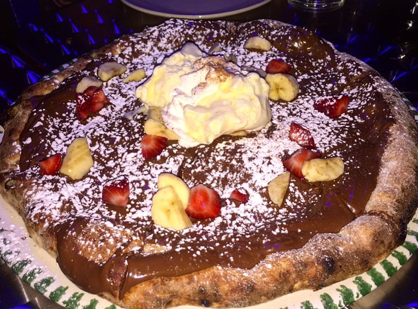 We finished dinner, digested for a minute, and decided we had some room for dessert. We looked at the dessert menu full of the usual cheesecakes, tartufo, tiramisu, and gelato, but immediately chose the “Blue Eyes Pizza” after finding out my best friend of 20 years has never had Nutella (insert a few WTFs and shocked faces). The dessert pizza came out topped with Nutella, Fresh Bananas & Strawberries and Vanilla Gelato. YUMMAYYYY. Looks like i’ll be at the gym twice today….